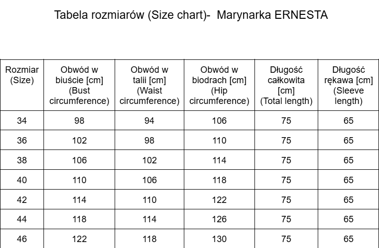 Zachęcamy do zapoznania się z tabelą rozmiarów. Wymiary podane w tabelach są obwodami płaszcza, a nie sylwetki, która powinna go nosić.