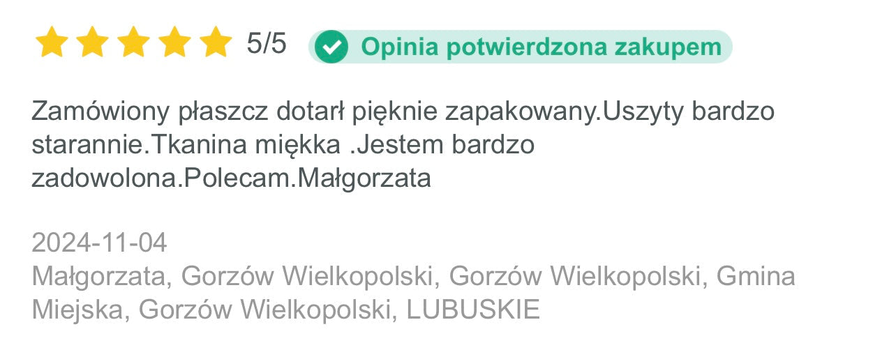 Posiadanie własnej szwalni sprawia, że nic nas nie ogranicza! Możemy szyć w dowolnych rozmiarach, kolorach i fasonach. Gdy dodatkowo stoi za nami wieloletnie doświadczenie rodzinnej firmy to możemy tworzyć modę dokładnie tak, jak tego chceMY (My i Wy!). Od początku istnienia marki słuchamy Waszych uwag, szyjemy modele, które chciałybyście zobaczyć w kolekcji i odpowiadamy na praktyczne potrzeby pojawiające się w czasie noszenia naszych płaszczy.