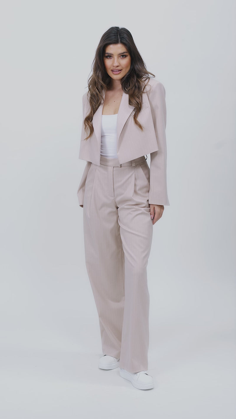 Eleganckie, długie spodnie z wysokim stanem, z szerokimi, prostymi nogawkami. Zapinane na kryty zamek, guzik oraz na dwie haftki. Model z szlufkami. Z przodu dwie boczne, wpuszczane kieszenie. Z przodu przy kieszeniach dwie zakładki.