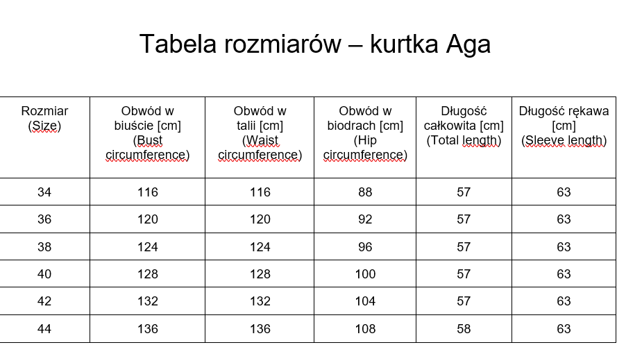 Zachęcamy do zapoznania się z tabelą rozmiarów. Wymiary podane w tabelach są obwodami płaszcza, a nie sylwetki, która powinna go nosić.