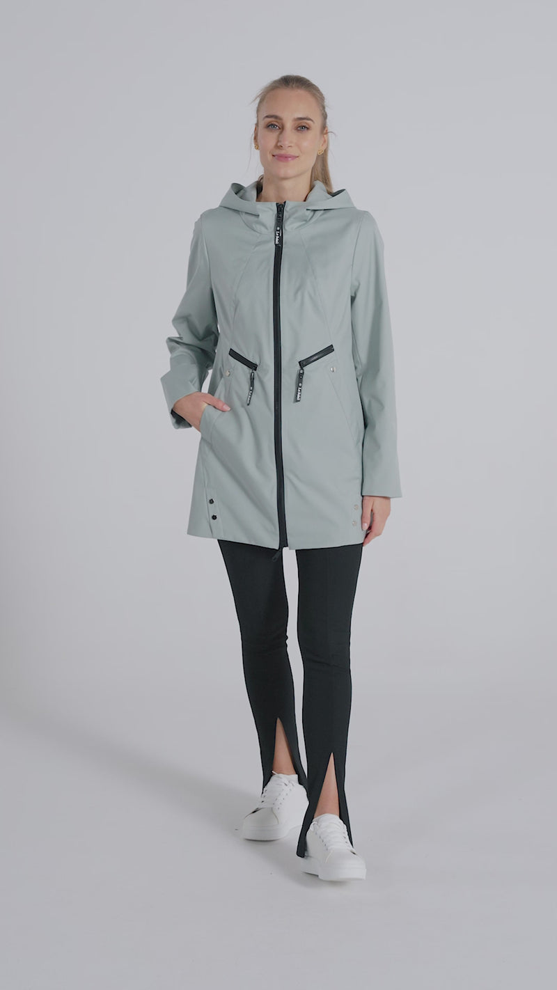 Sportowa, przeciwdeszczowa, o długości do połowy uda kurtka, z nieodpinanym kapturem, zapinana na szeroki zamek, Z przodu, po bokach dwie wpuszczane kieszenie, nad kieszeniami ozdobne zamki. Tył gładki, bez rozporka. Fason na podszewce, idealny na wiosnę i jesień.