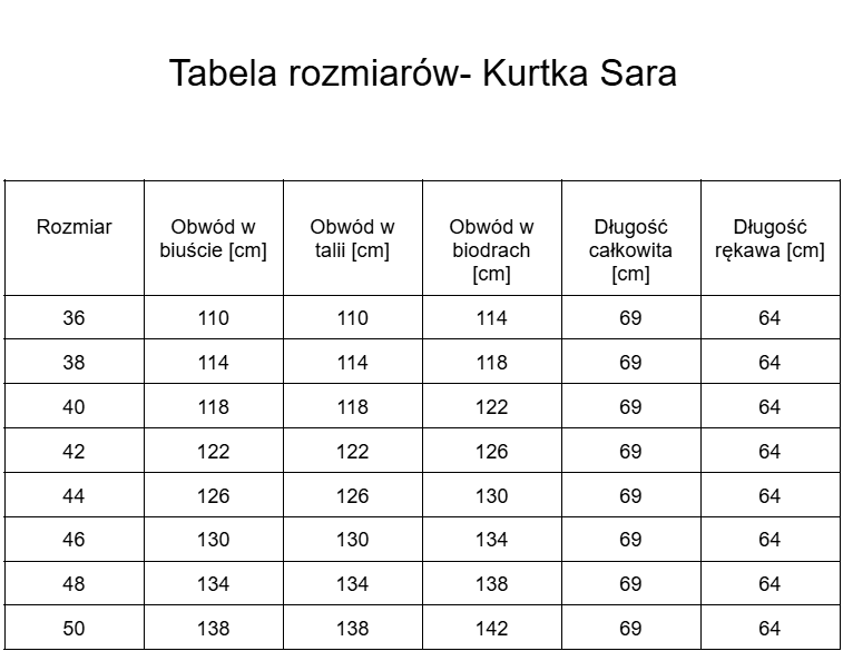 Zachęcamy do zapoznania się z tabelą rozmiarów. Wymiary podane w tabelach są obwodami płaszcza, a nie sylwetki, która powinna go nosić.