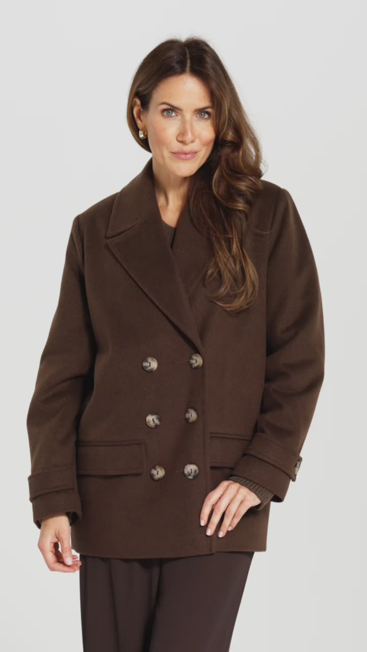 Ta kurtka to ukłon w stronę klasyki, ale z nowoczesnym podejściem do proporcji. Duże klapy przy kołnierzu, podwójny rząd guzików i patki na kieszeniach dodają charakteru, ale nie dominują. To fason, który daje Ci przestrzeń – i zostawia wybór, jak go nosić.