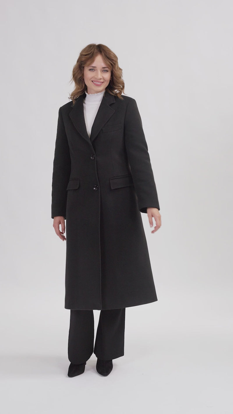 Długi, elegancki, taliowany, jednorzędowy płaszcz. Zapinany na guziki, z klasycznym, rewersowym kołnierzem. Po bokach oraz na linii biustu po lewej stronie, poziome wpuszczane kieszenie. Na rękawach 3 ozdobne guziki. Tył gładki, z wysokim zakładanym rozporkiem. Produkt lekko ocieplony, idealny na jesień i zimę.