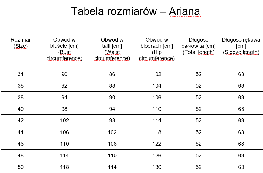 Zachęcamy do zapoznania się z tabelą rozmiarów. Wymiary podane w tabelach są obwodami płaszcza, a nie sylwetki, która powinna go nosić.