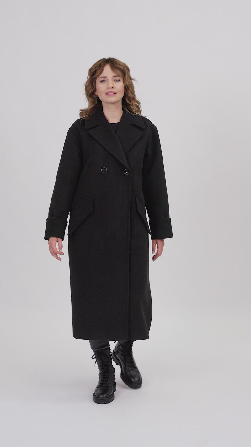 Długi, elegancki, jednorzędowy płaszcz, zapinany na kryte napy oraz dodatkowy podwójny guzik, z klasycznym rewersowym kołnierzem. Z przodu dwie skośne kieszenie, ozdobione patkami. Opuszczane rękawy, zakończone imitacją mankietu. Model o kroju oversize, w związku z czym zachęcamy wybór mniejszego rozmiaru. Tył gładki, bez rozporka, na podszewce, ocieplany, idealny na jesień i zimę.