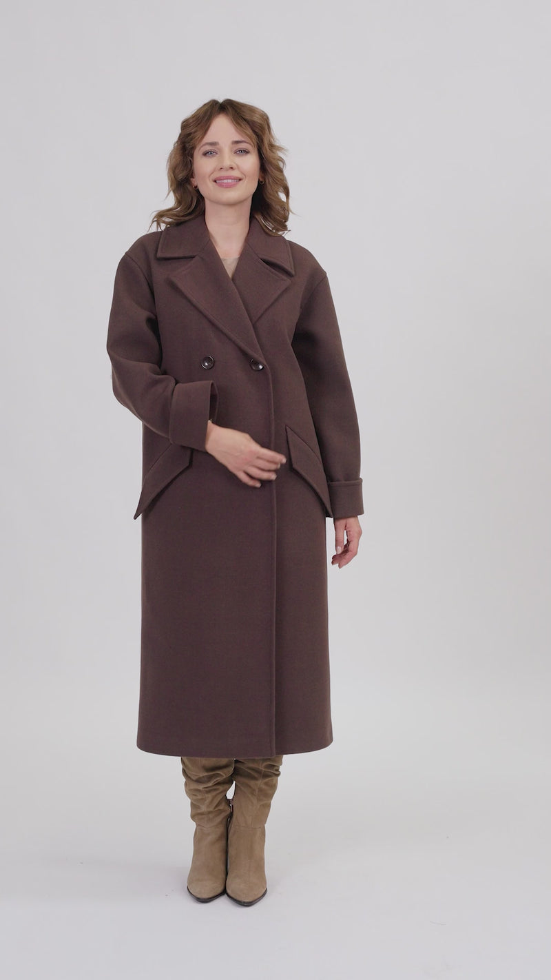 Długi, elegancki, jednorzędowy płaszcz, zapinany na kryte napy oraz dodatkowy podwójny guzik, z klasycznym rewersowym kołnierzem. Z przodu dwie skośne kieszenie, ozdobione patkami. Opuszczane rękawy, zakończone imitacją mankietu. Model o kroju oversize, w związku z czym zachęcamy wybór mniejszego rozmiaru. Tył gładki, bez rozporka, na podszewce, ocieplany, idealny na jesień i zimę.