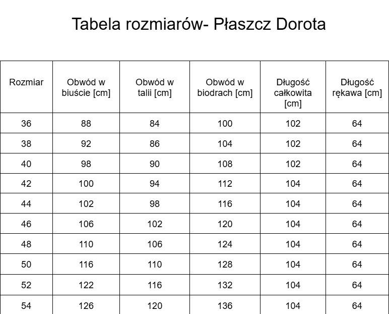 Zachęcamy do zapoznania się z tabelą rozmiarów. Wymiary podane w tabelach są obwodami płaszcza, a nie sylwetki, która powinna go nosić.