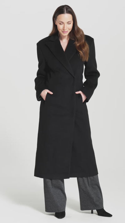 Frankie nie potrzebuje paska. Jego konstrukcja mówi sama za siebie. Mocne ramiona z dużymi poduszkami, taliowanie i klapy smokingowe w szpic tworzą efekt „marynarki w wersji maxi”. Z klasą, ale też z wyrazem.