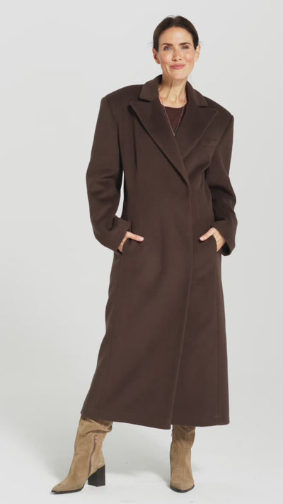Frankie nie potrzebuje paska. Jego konstrukcja mówi sama za siebie. Mocne ramiona z dużymi poduszkami, taliowanie i klapy smokingowe w szpic tworzą efekt „marynarki w wersji maxi”. Z klasą, ale też z wyrazem.