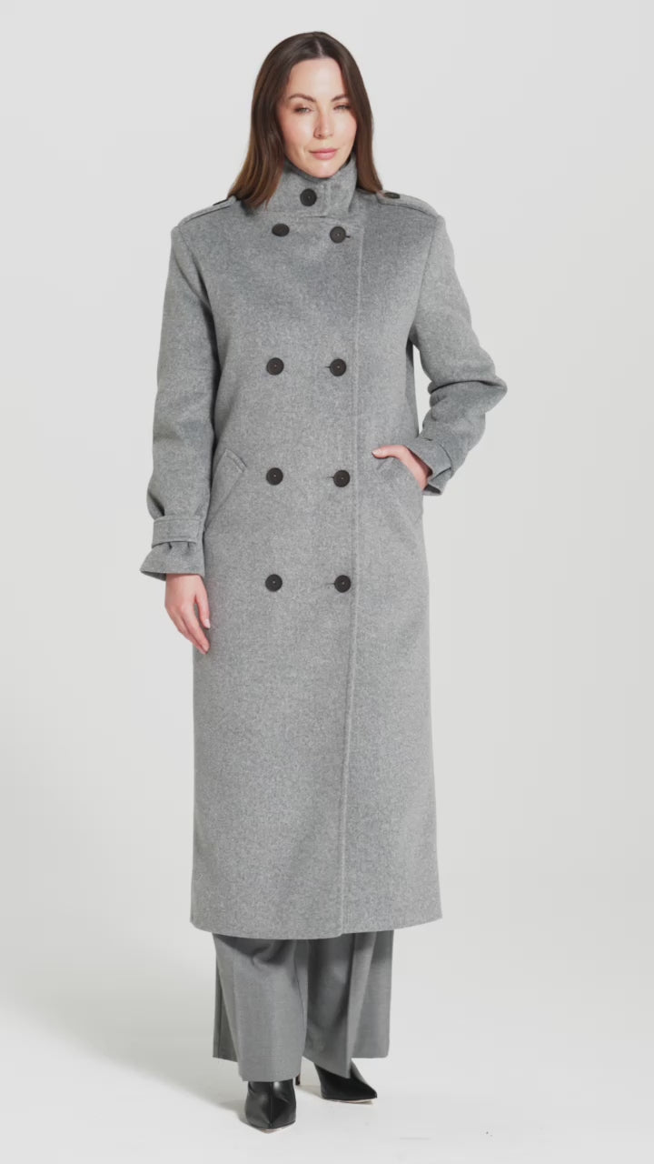 Podwójny rząd kontrastowych guzików wprowadza geometrię i podkreśla militarną symetrię. Tył pozostaje dopracowany — rozcięcie u dołu zapewnia swobodę ruchu mimo pełnej długości płaszcza.