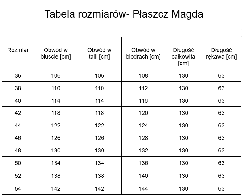 Zachęcamy do zapoznania się z tabelą rozmiarów. Wymiary podane w tabelach są obwodami płaszcza, a nie sylwetki, która powinna go nosić.