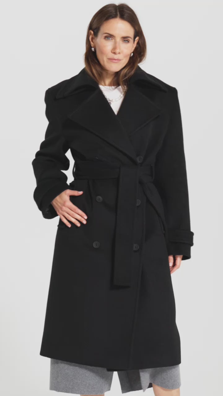 Ten płaszcz nie udaje lekkości. Zaprojektowany tak, by było widać formę, konstrukcję i krawiecką precyzję. Podwójny kołnierz i szerokie klapy tworzą mocną górę, która buduje sylwetkę – niezależnie od tego, czy nosisz płaszcz luźno, czy z paskiem.