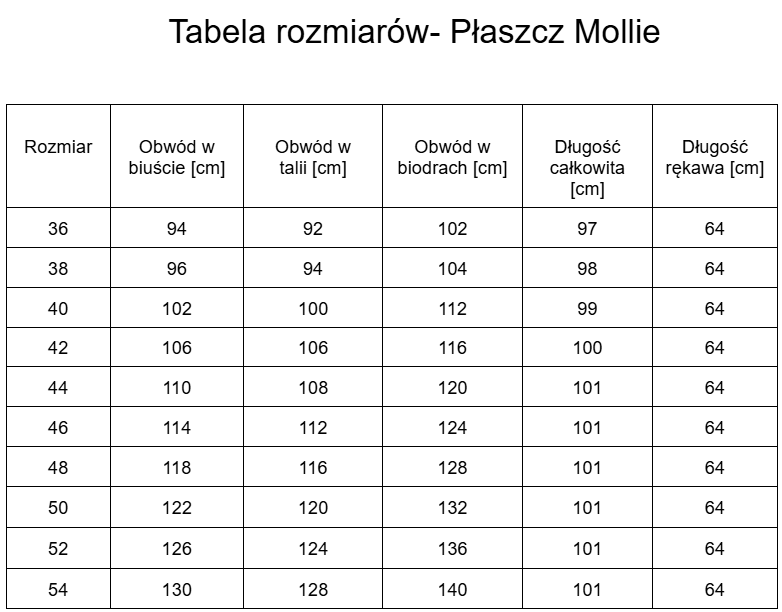 Zachęcamy do zapoznania się z tabelą rozmiarów. Wymiary podane w tabelach są obwodami płaszcza, a nie sylwetki, która powinna go nosić.