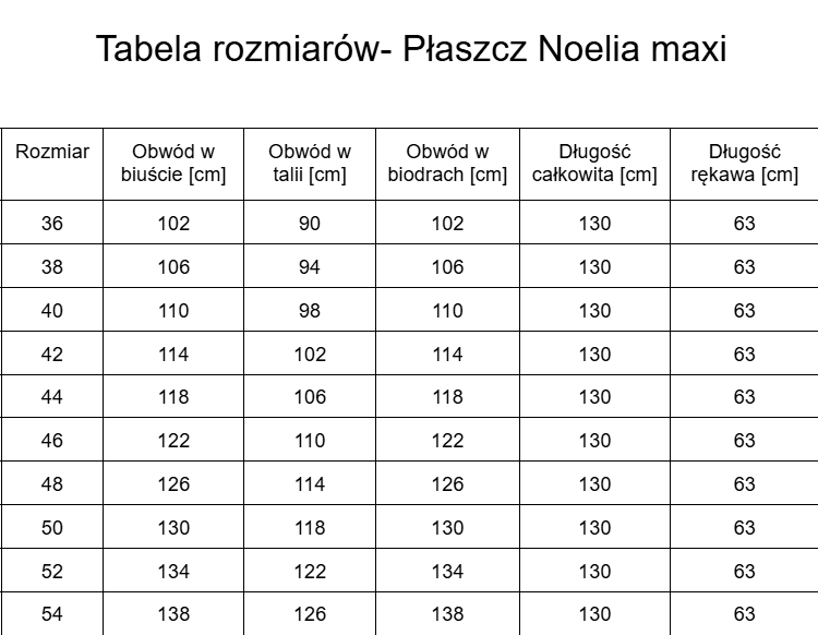 Zachęcamy do zapoznania się z tabelą rozmiarów. Wymiary podane w tabelach są obwodami płaszcza, a nie sylwetki, która powinna go nosić.