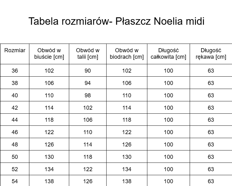 Zachęcamy do zapoznania się z tabelą rozmiarów. Wymiary podane w tabelach są obwodami płaszcza, a nie sylwetki, która powinna go nosić.