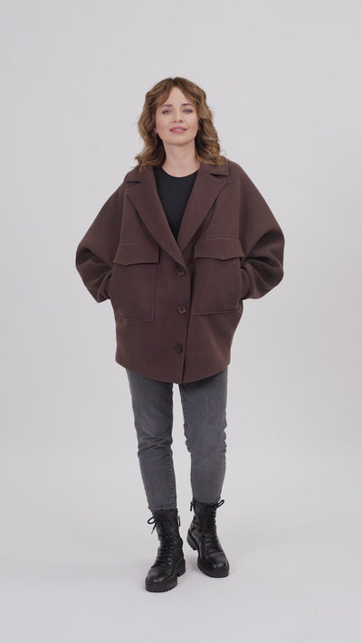 Głębokie klapy i dekolt w serek tworzą przestrzeń dla szyi i dodatków – tu możesz grać warstwami.
