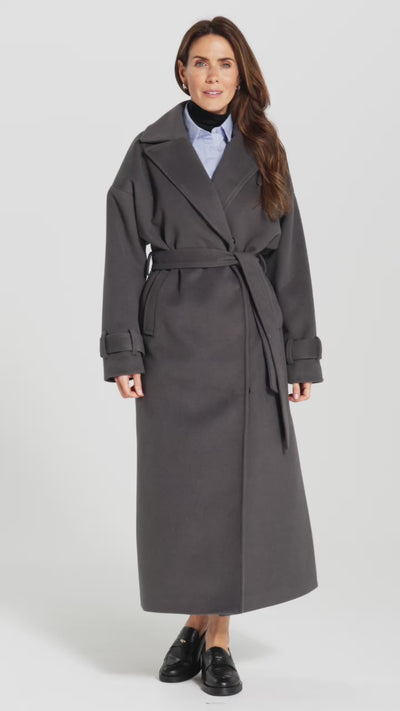 Ten jednorzędowy płaszcz w modnym fasonie oversize jest zapinany na dyskretne kryte napy. Ozdobiony jest paskiem u rękawów i dwiema wpuszczanymi kieszeniami, co dodaje mu charakteru. Po bokach znajdują się głębokie rozcięcia, a po lewej stronie patka imitująca kieszeń.