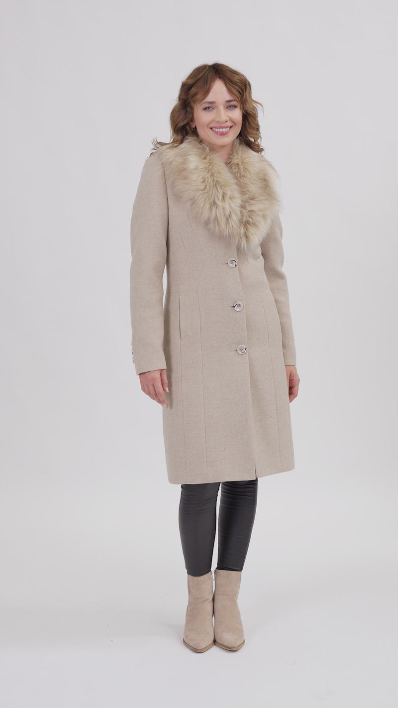Elegancki, taliowany, jednorzędowy długi płaszcz pod kolano, zapinany na guziki z dwiema kieszeniami z przodu. Fason z tradycyjnym kołnierzem z możliwością zapięcia pod szyję. Model posiada dopinaną futrzaną etolę. Rękawy ozdobione trzema guzikami. Tył gładki bez rozporka. Produkt ocieplany na podszewce idealny na jesień i zimę.
