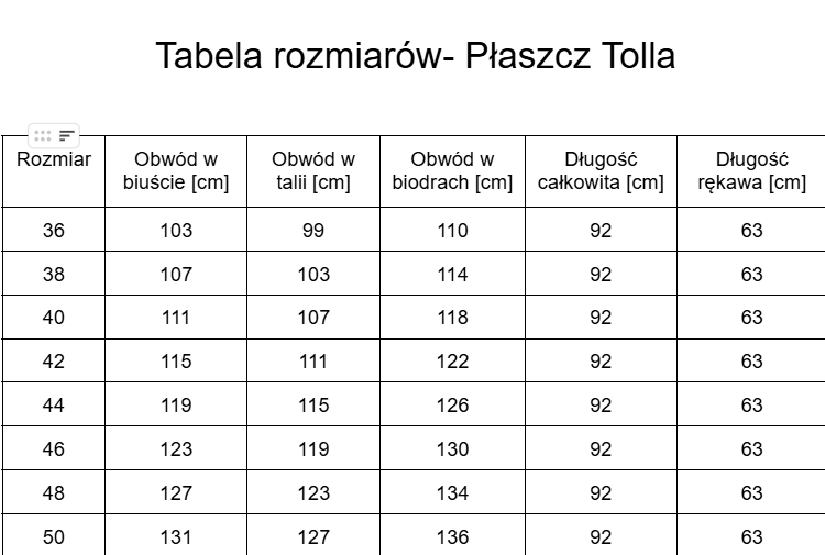 Zachęcamy do zapoznania się z tabelą rozmiarów. Wymiary podane w tabelach są obwodami płaszcza, a nie sylwetki, która powinna go nosić.