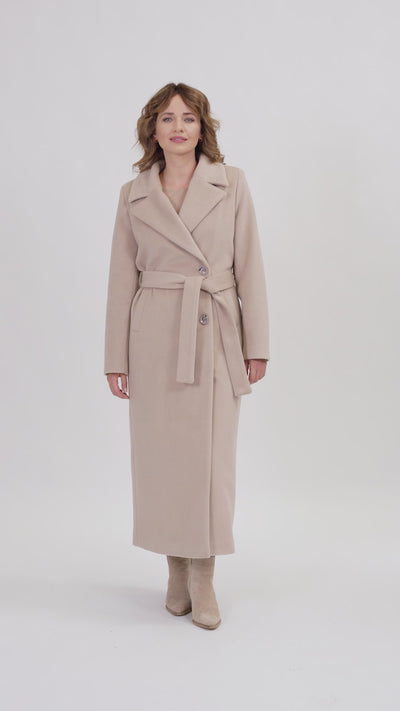 Ma wszystko, co powinien mieć klasyk – i ani grama zbędnych dodatków. Długość maxi wydłuża sylwetkę. Klapy i kołnierz trzymają linię. Dwa guziki jeden pod drugim to mocny akcent – ale pod nimi ukryliśmy autorskie zapięcie na napy, które porządkuje całość i daje czystość formy.