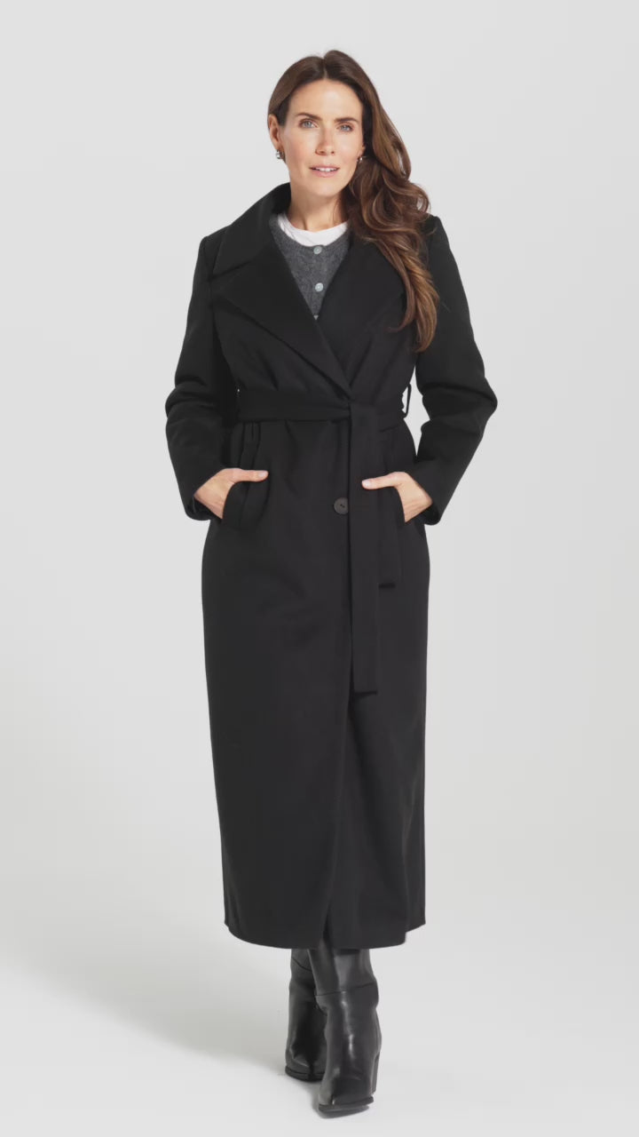 Ma wszystko, co powinien mieć klasyk – i ani grama zbędnych dodatków. Długość maxi wydłuża sylwetkę. Klapy i kołnierz trzymają linię. Dwa guziki jeden pod drugim to mocny akcent – ale pod nimi ukryliśmy autorskie zapięcie na napy, które porządkuje całość i daje czystość formy.