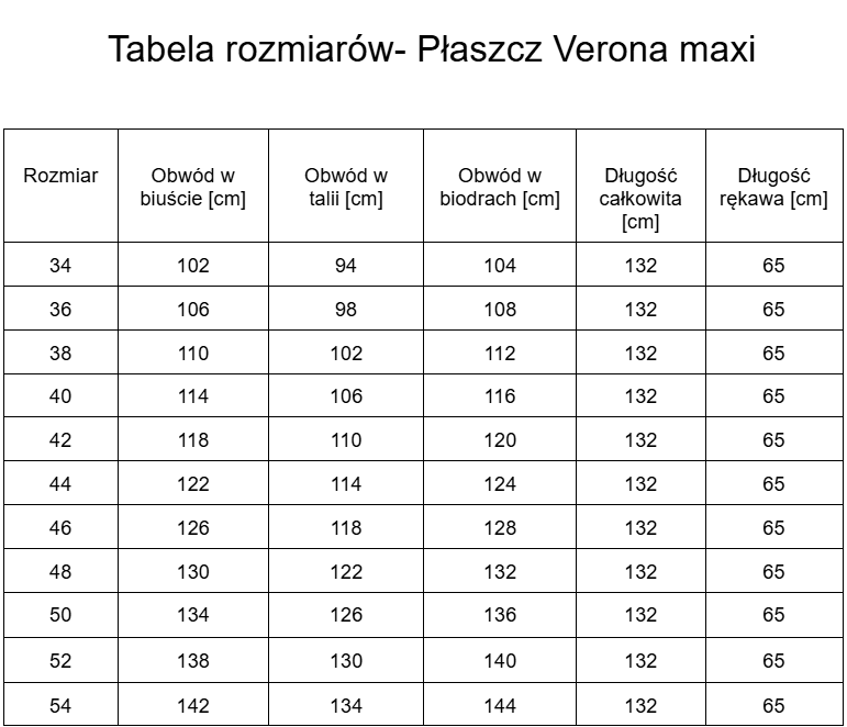 Zachęcamy do zapoznania się z tabelą rozmiarów. Wymiary podane w tabelach są obwodami płaszcza, a nie sylwetki, która powinna go nosić.