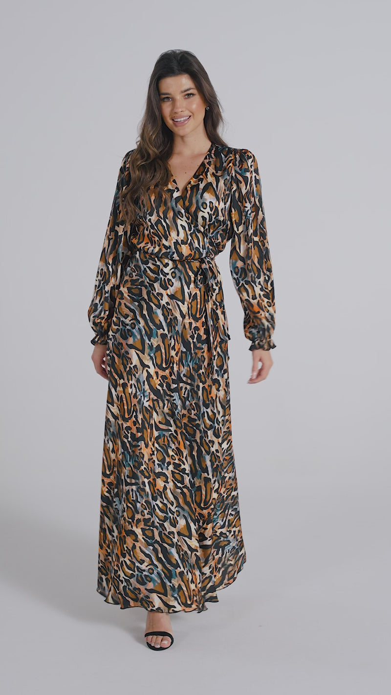 Długa, zwiewna, o szlafrokowym kroju sukienka, odcinana w pasie.