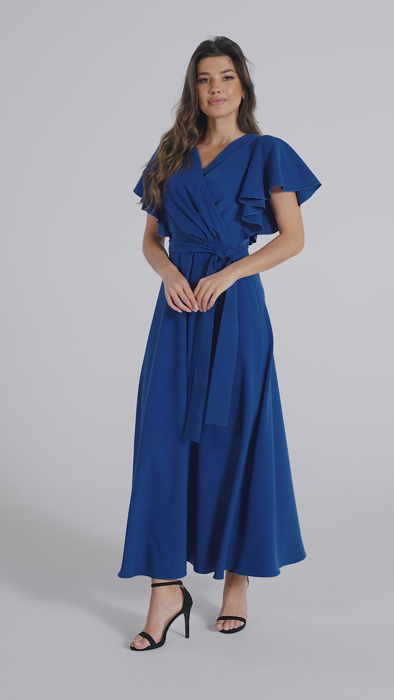 Długa, elegancka, rozkloszowana sukienka, na podszewce, odcinana w pasie. Z przodu zakładany drapowany dekolt w szpic. Po bokach wszyte szerokie falbany tworzące motylkowy rękaw. Tył zapinany na kryty zamek. Model posiada luźny pasek, dzięki któremu można podkreślić talię.