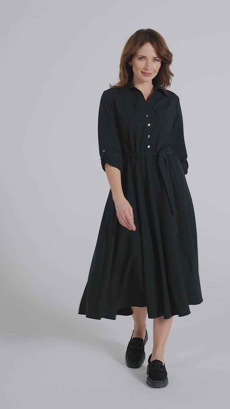 Elegancka, pełna szyku, midi sukienka, odcinana w pasie z rozkloszowanym dołem. Przód zapinany na ozdobne guziki, dekolt w szpic, z kołnierzem. U góry, po lewej stronie naszyta kieszonka, po bokach dwie wpuszczane kieszenie. Fason z rękawem ¾ z możliwością regulacji, dzięki wszytej patce z guzikiem.