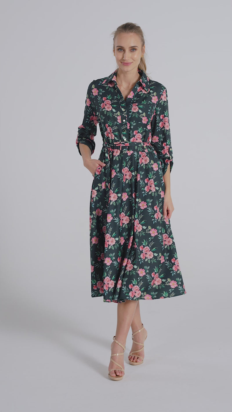 Elegancka, pełna szyku, midi sukienka, odcinana w pasie z rozkloszowanym dołem. Przód zapinany na ozdobne guziki, dekolt w szpic, z kołnierzem. U góry, po lewej stronie naszyta kieszonka, po bokach dwie wpuszczane kieszenie. Fason z rękawem ¾ z możliwością regulacji, dzięki wszytej patce z guzikiem.