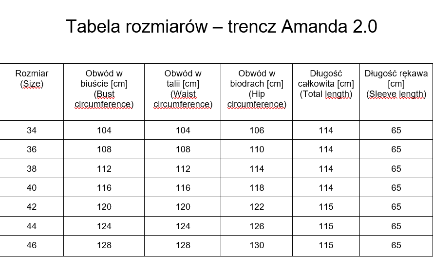 Zachęcamy do zapoznania się z tabelą rozmiarów. Wymiary podane w tabelach są obwodami płaszcza, a nie sylwetki, która powinna go nosić.