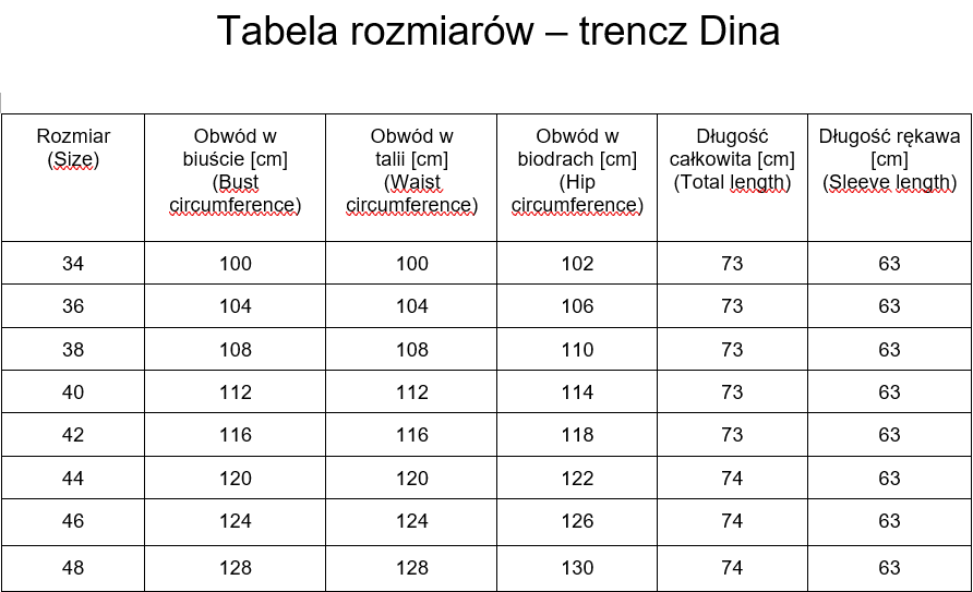 Zachęcamy do zapoznania się z tabelą rozmiarów. Wymiary podane w tabelach są obwodami płaszcza, a nie sylwetki, która powinna go nosić.
